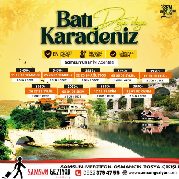 SAMSUN GEZİYOR TURİZM olarak, Kültür Turları kapsamında güzel yurdumuzun kültürel ve coğrafi zenginliklerini uzmanlaşmış personelimiz eşliğinde, siz değerli dostlarımıza tanıtmak amacı ile hazırlamış olduğumuz turumuza sizleri alarak Safranbolu‘ya doğru yola çıkarak başlıyoruz.