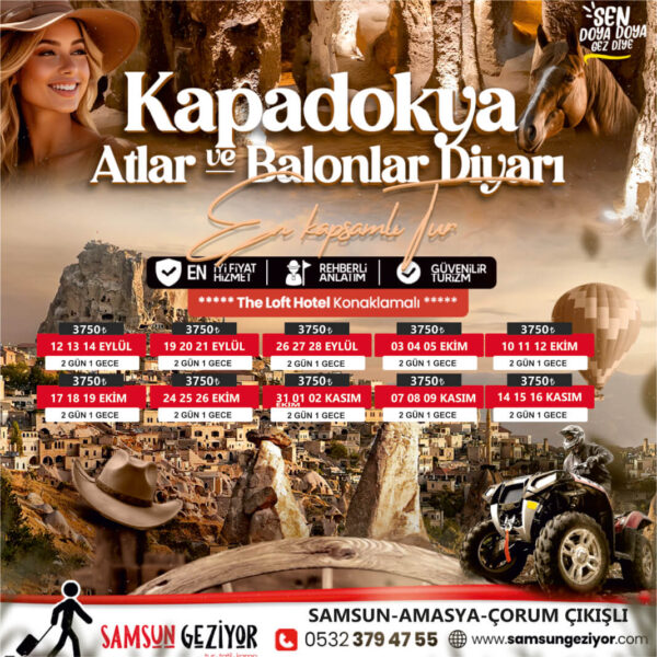 SAMSUN GEZİYOR TURİZM olarak, kültür turları kapsamında güzel yurdumuzun kültürel ve coğrafi zenginliklerini, uzmanlaşmış personelimiz eşliğinde siz değerli dostlarımıza tanıtmak amacıyla hazırladığımız turumuza, Samsun’dan Nevşehir’e doğru yola çıkıyoruz.